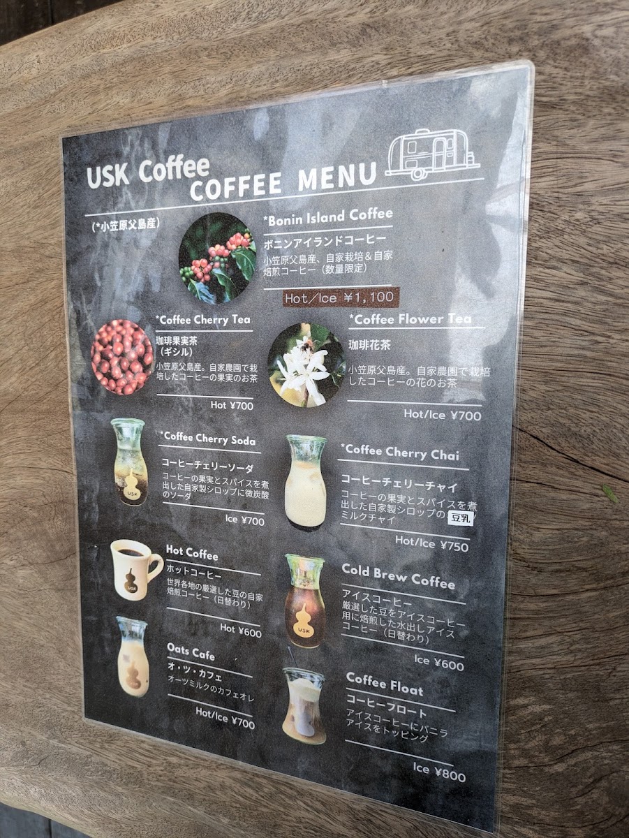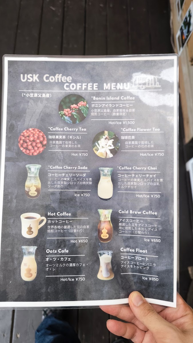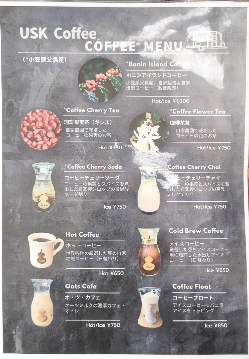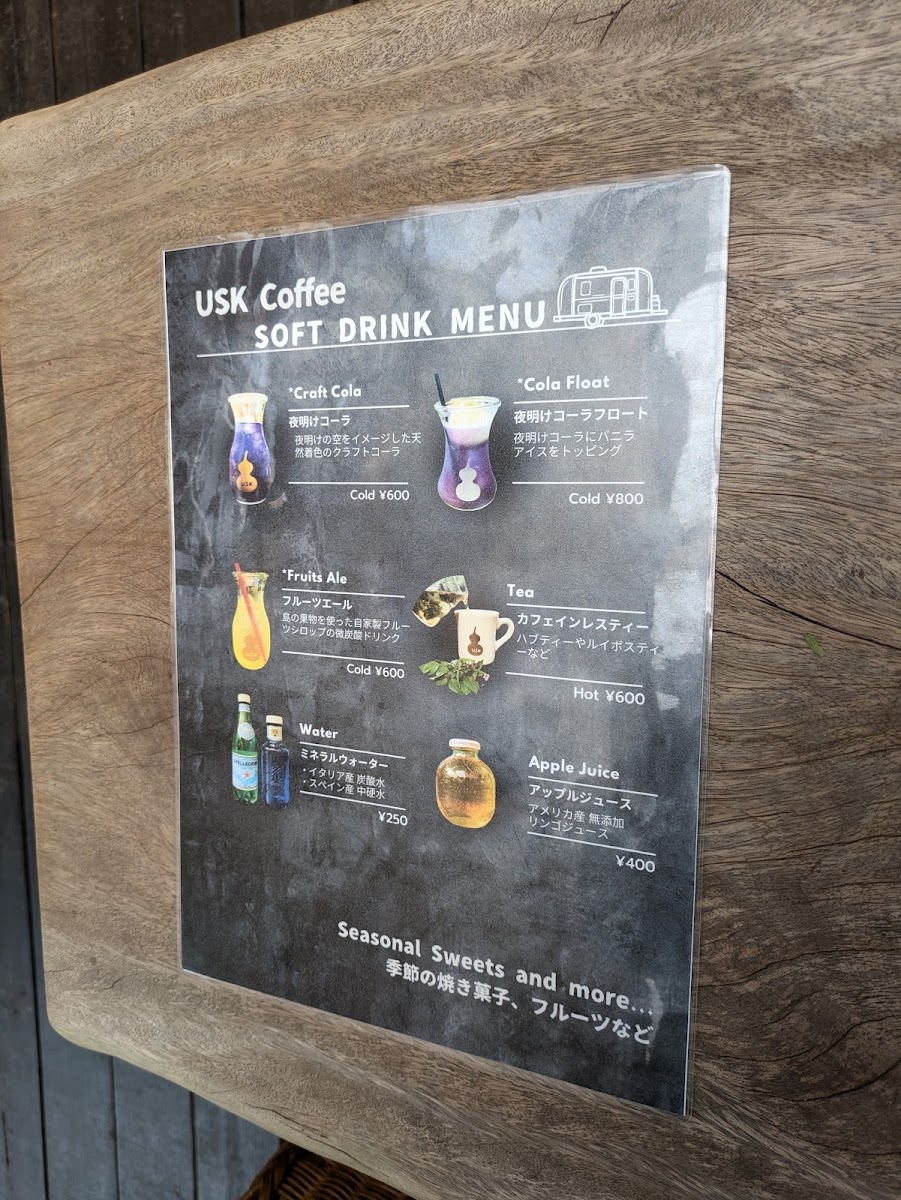 At Usk Coffee, the menu feels like a compact showcase of island character expressed through coffee and desserts, where simple presentations carry memorable flavors. The foundation is classic カフェ and アイス コーヒー, clean and straightforward, letting the beans speak without distraction. For those who enjoy a playful twist, コーヒーフロート adds creamy indulgence to the coffee’s bitterness, while クリームソーダ brings a nostalgic, refreshing contrast. A standout highlight is 貴重な小笠原コーヒー, which emphasizes the rarity and local pride of Ogasawara-grown beans, offering a taste that feels rooted in place rather than mass-produced. This sense of locality continues with ボニンアイランドコーヒー アイス, a chilled expression that remains aromatic and smooth even over ice. Dessert pairings are a major strength of the menu, especially ボニンアイランドコーヒーとカントリープリン and コーヒーとプリン, where the gentle sweetness of pudding balances the coffee’s depth. More adventurous sweets like フローズンパッションパンナコッタ and パッションパンナコッタ 美味しいよ introduce tropical brightness, adding a refreshing island note that feels perfectly suited to the setting. The house creativity really shines in combinations such as uskコーヒー バナナシフォンケーキとコーヒーフロート サイコーです, which layers soft banana chiffon cake with coffee and ice cream for a satisfying, comforting treat. Beverage options beyond coffee are equally interesting, from the spiced, refreshing クラフトコーラ to the unique コーヒ豆の皮のドリンク, which highlights sustainability and curiosity by transforming coffee bean husks into a drinkable experience. Altogether, the menu reads as a thoughtful collection of drinks and desserts that balance familiarity with local identity, making each item feel intentional and reflective of the relaxed yet distinctive atmosphere of the island café.